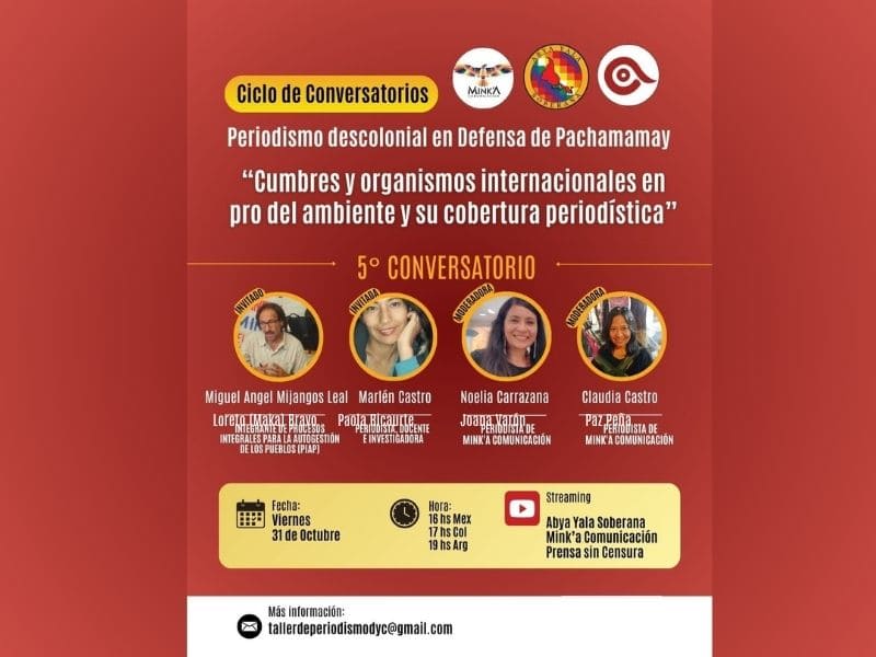 Desde el espacio Abya Yala Soberana, y por iniciativa de Amapola Periodismo Transgresor y Mink’a Comunicación, el Viernes 31 de octubre se llevará a cabo el Quinto Conversatorio del Ciclo de Periodismo Descolonial en Defensa de Pachamamay, a las 16 horas (Centroamérica) y 19 horas (Argentina), de forma virtual.
