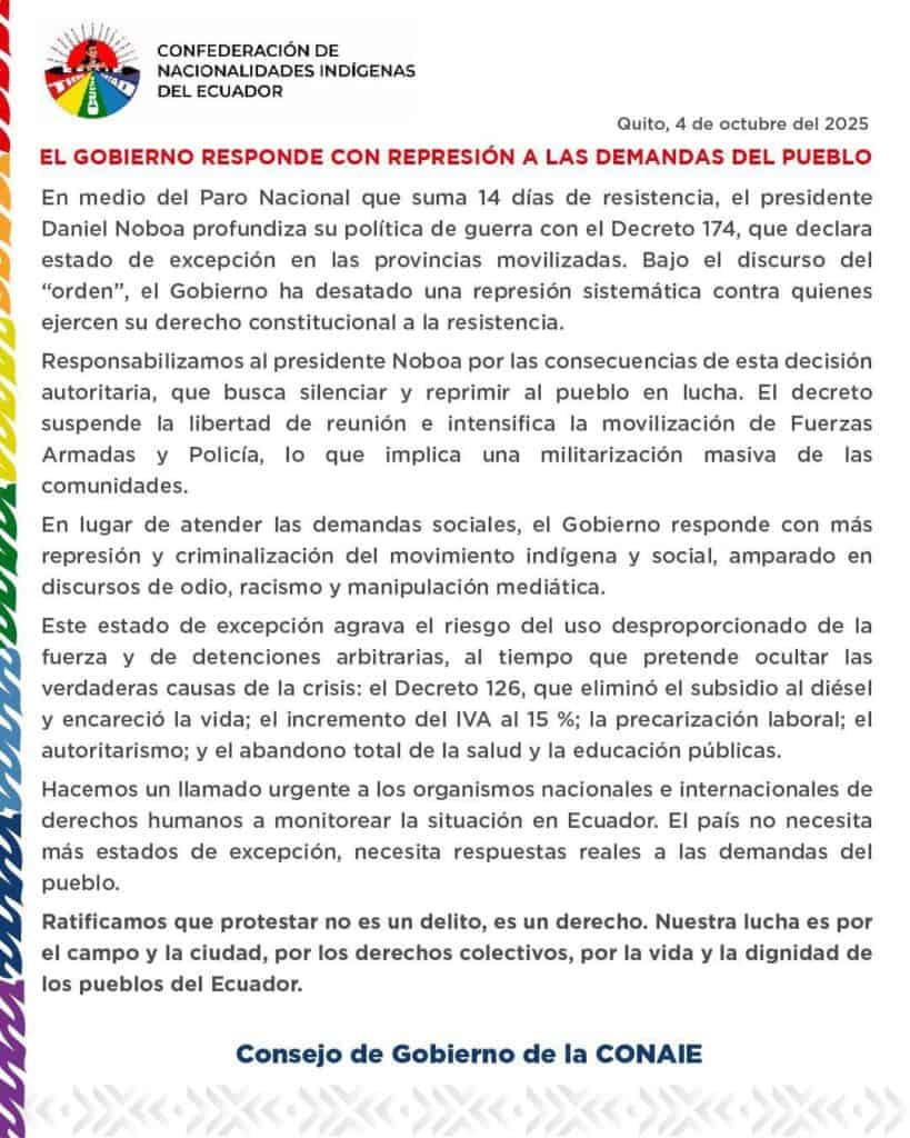 Hoy mediante un comunicado oficial, la CONAIE denunció las acciones del Gobierno de Daniel Noboa y señaló que el «estado de excepción agrava el riesgo del uso desproporcionado de la fuerza y de detenciones arbitrarias, al tiempo que pretende ocultar las verdaderas causas de la crisis». Además, detalló que «el país no necesita más estados de excepción, necesita respuestas reales a las demandas del pueblo».